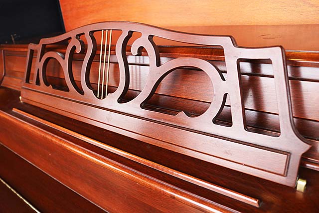 濃い目のウォルナットと各所の装飾が目をひくアンティーク調ピアノ。優雅な透かし彫り譜面台や伝統家具のような丸脚の他、開くと本体に収納される引き出しタイプの鍵盤蓋など、各所に深いこだわりが感じられます。