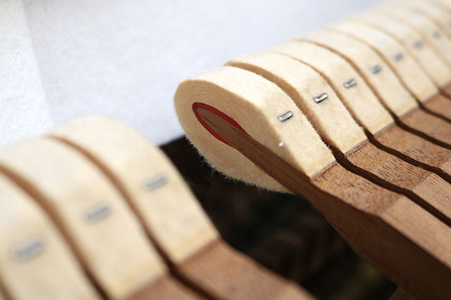 大型譜面台の裏には音を前面に響かせるトーンエスケープ、ハンマーはオールアンダーフェルト入り、屋根は少し開けた状態にできるストッパーで音の調節ができます。